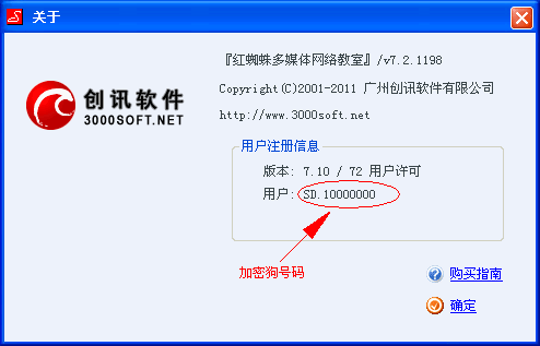 在教師機上,打開《紅蜘蛛軟件》的教師機端程序,在主窗口上,進(jìn)入「功能菜單」按鈕下的「關(guān)于」菜單項打開的窗口,就可以查看到加密狗號碼。如下面的圖示: