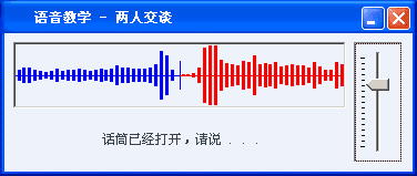 如圖所示,窗口左邊顯示的是正在錄音的波形,也就是您自己的聲音;而窗口右邊則是正在播放的波形,也就是對方的聲音。位于窗口右方的音量控制器允許您改變播放聲音的音量大小。