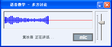 對于“多方討論”服務,操作上會有稍微不同,它在教師機和學生機上打開的“網上語音服務”窗口,相對于其它兩種服務,這里多了“MIC”按鈕,如下圖所示。因為存在多方講話者,所以您需要首先拿到“話筒”才能開始講話,將聲音傳送給其它人。當沒有人講話時,您可以將鼠標移到“MIC”按鈕上,然后按下鼠標左鍵不放,這時鼠標形狀變為一個麥克風形狀,表示您拿到了“話筒”,可以開始講話,等您說完了,只須放開鼠標左鍵,就可以將“話筒”交到其它人手上。