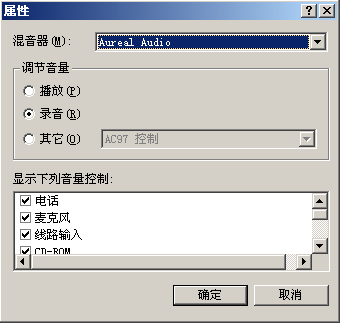 在對話框的菜單中,選擇“選項-->屬性”會彈出如圖所示的窗口,確定“混音器”列表選中的正是您所使用的聲卡,再將“調(diào)節(jié)音量”選擇為“錄音”,然后將“顯示下列音量控制”的列表框中的選項全部選中,其中確保“麥克風”和“立體聲混音”被選中,最后點擊“確定”,回到“錄音控制”對話框中。