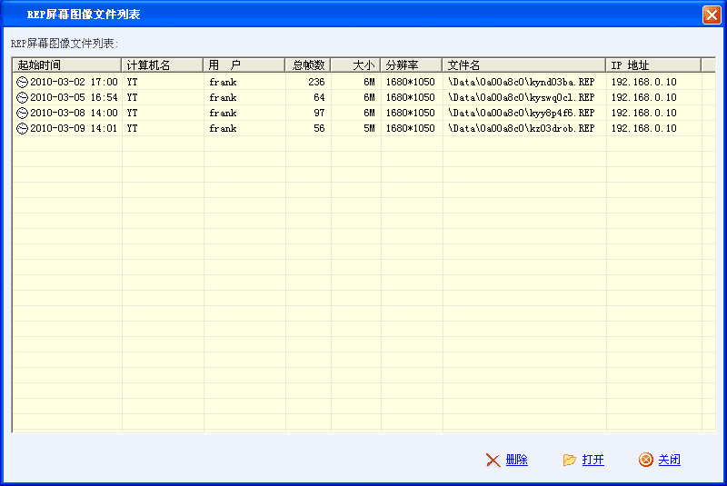 列表中顯示的屏幕圖像文件包含一些基本信息:起始時間、計算機名、用戶、總幀數等,您可以根據這些信息區別眾多的文件,點擊各列支持排序。