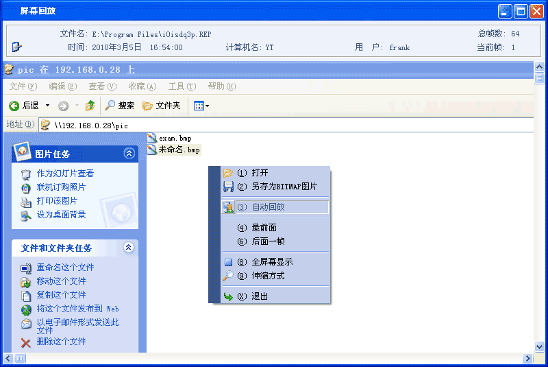 通過雙擊某個文件或選擇某個屏幕圖像文件后點擊“打開”按鈕,進入“屏幕回放”窗口,如圖所示。通過圖中所示的右鍵菜單您可以進行各種操作。