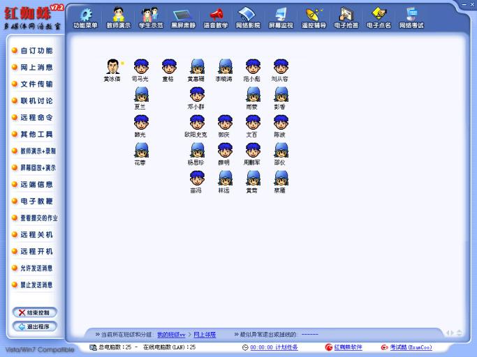 紅蜘蛛軟件主要在局域網絡上實現多媒體信息的教學廣播,是一款實現在電子教室、多媒體網絡教室或者電腦教室中進行多媒體網絡教學的非常好的軟件產品,集電腦教室的同步教學、控制、管理、音視頻廣播、網絡考試等功能于一體,并能同時實現屏幕監視和遠程控制等網絡管理的目的。它專門針對電腦教學和培訓網絡開發,可以非常方便地完成電腦教學任務,包括屏幕教學演示與示范、屏幕監視、遙控輔導、黑屏肅靜、屏幕錄制、屏幕回放、VCD/MPEG/AVI/MP3/WAV/MOV/RM/RMVB等視頻流的網絡播放、網絡考試和在線考試、試卷管理和共享、網上語音廣播、兩人對講和多方討論、語音監聽、聯機討論、同步文件傳輸、提交作業、遠程命令、電子教鞭、電子黑板與白板、電子搶答、電子點名、網上消息、電子舉手、獲取遠端信息、獲取學生機打開的程序和進程信息、學生上線情況即時監測、鎖定學生機的鍵盤和鼠標、遠程開關機和重啟、學生機同步升級服務、計劃任務、時間提醒、自定義功能面板、班級和學生管理等,對于傳統的教學模式來說,這是一種教學上的突破。