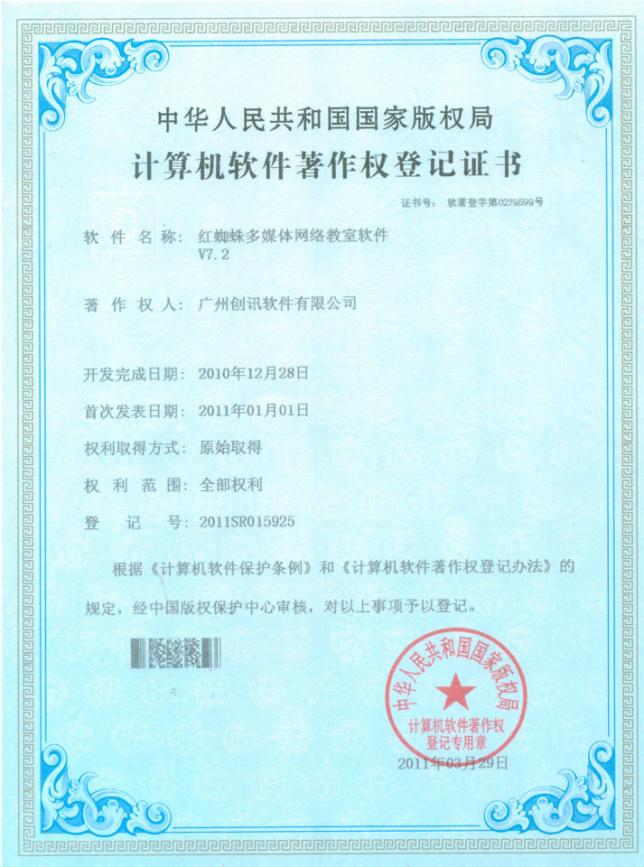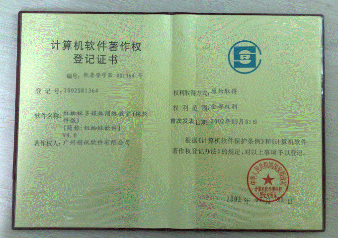 對于我公司開發的《紅蜘蛛多媒體網絡教室》軟件產品,保證為自行開發的正版軟件(版權登記號:2002SR1364/2011SR015925),符合公開發布的最新版本軟件試用版本所展現之實測功能和性能,為軟件包中隨帶的加密鎖提供三年質保,質保期內,如非人為損壞,提供免費更換服務,提供全免費的網上自助升級服務,提供免費的在線QQ或電話方式的技術支持服務: